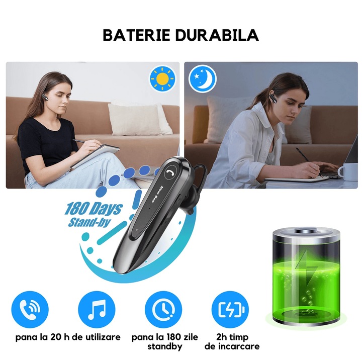 Castile ofera pana la 24 de ore de ascultare si 20 de ore de convorbire cu o singura incarcare, facandu-l ideal pentru zile lungi de munca sau pentru utilizarea intensa a telefonului. Bateria de lunga durata mentine dispozitivul in standby pana la 180 de zile, eliminand nevoia de incarcare frecventa. In plus, dureaza doar 2 ore pentru a se incarca complet, asa ca nu trebuie sa asteptati prea mult pana cand este gata sa continue sa functioneze.