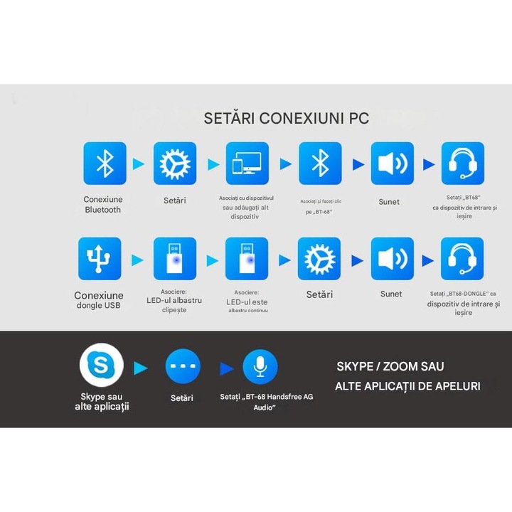 Aceste casti Bluetooth cu microfon accepta conexiune simultana la doua dispozitive si conectivitate dual mode (wireless prin Bluetooth sau adaptor USB) cu o raza stabila de 15 m (49 de picioare). Ca si casti wireless cu microfon, ofera difuzoare HiFi de 40 mm cu raspuns in frecventa 20Hz-20kHz pentru un sunet stereo captivant in apeluri/multimedia.