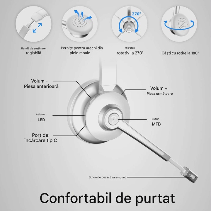 【CONFORT ERGONOMIC SI DESIGN FLEXIBIL】: Castile wireless cu microfon sunt concepute pentru confortul dumneavoastra, deoarece sunt dotate cu pernite din piele proteica moale si o banda de sustinere reglabila, care va permit sa ajustati unghiul de purtare perfect. Microfonul rotativ la 270° permite plasarea pe urechea stanga sau dreapta, in timp ce designul monoaural mentine zgomotul ambiental vizibil in timpul utilizarii prelungite.